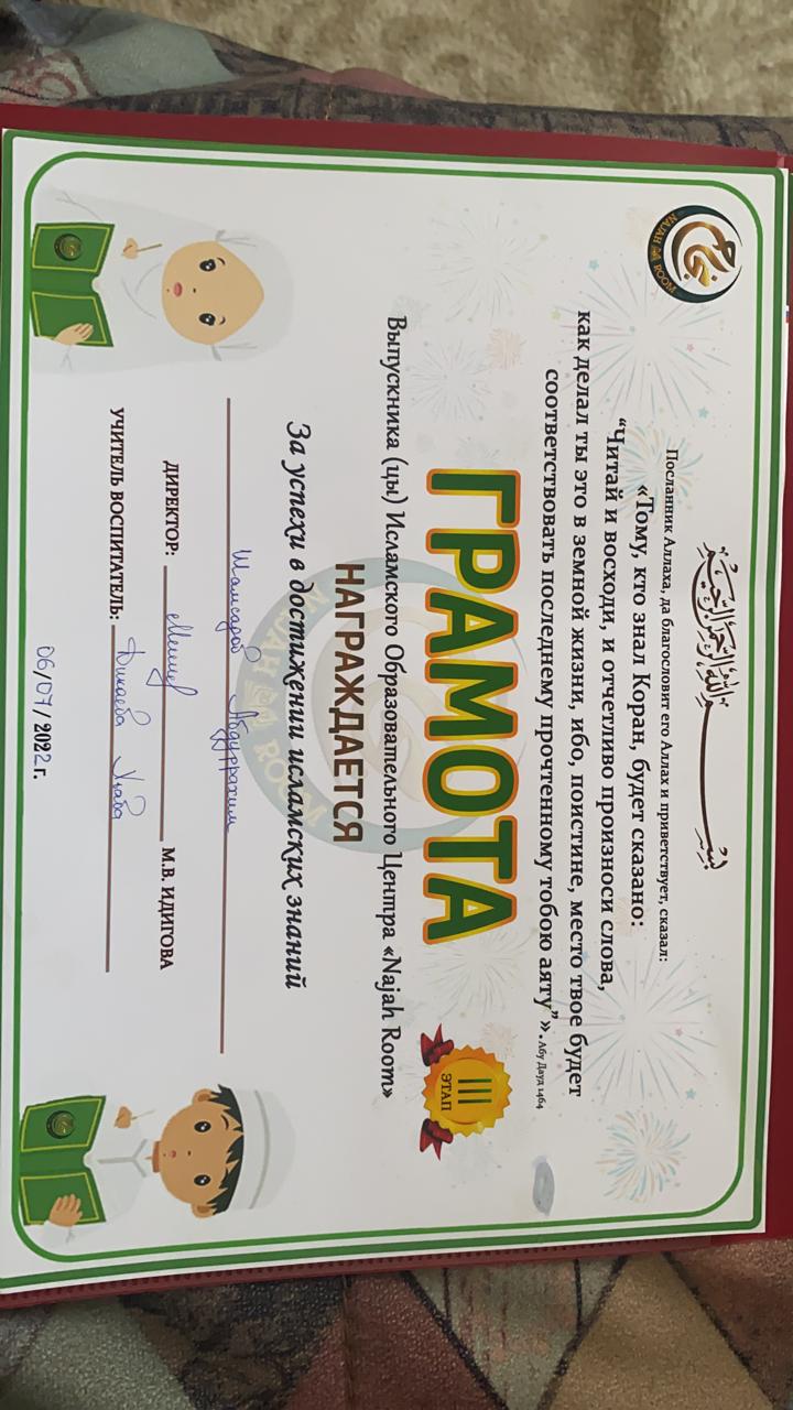 Шамсадов Абдурахим награжден грамотой за успехи в достижении исламских знаний