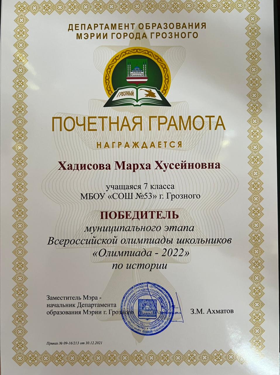 Хадисова Марха ученица МБОУ "СОШ №53" выиграла муниципальный этап ВСероссийской олимпиады школьников по истории.