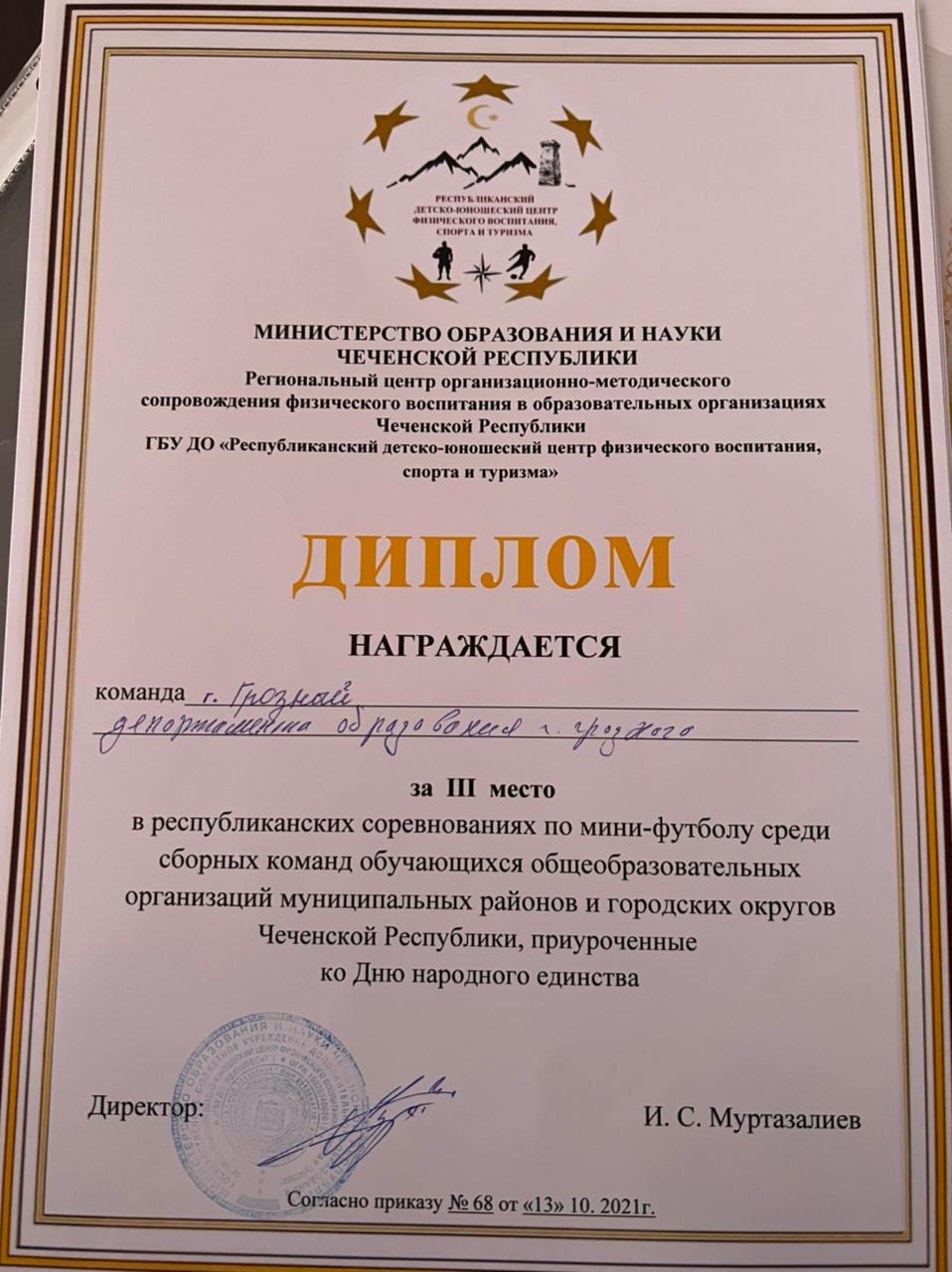13.10.2021Команда "город Грозный" департамента образования г. Грозного заняла почетное 3 место в республиканских соревнования по мини-футболу среди сборных команд районов и городских окрургов.