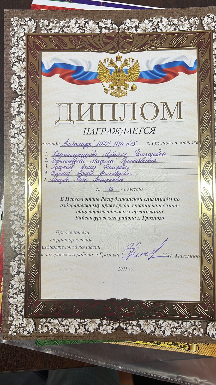 Команда "Амбассадор" МБОУ «СОШ № 53» заняло почетное 3 место в первом этапе Республиканской олимпиадыпо избирательному праву среди стершеклассников.