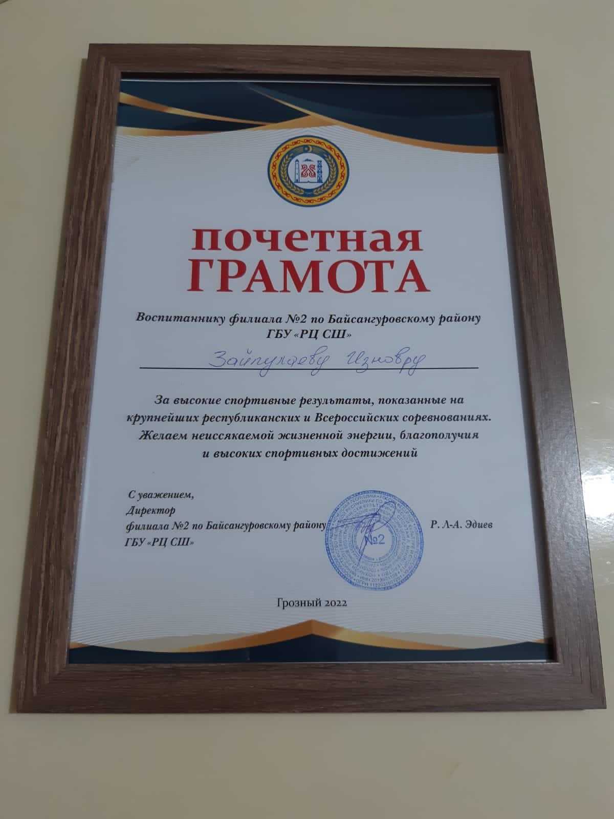 За многочисленные высокие спортивные достижения, показанные на различных соревнованиях почетной грамотой награжден ученик МБОУ "СОШ № 53" Зайпулаев Изновр.