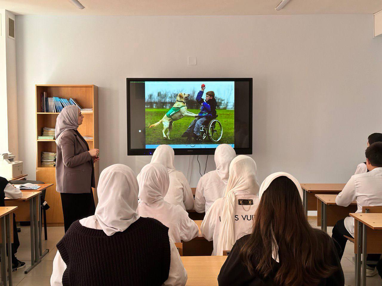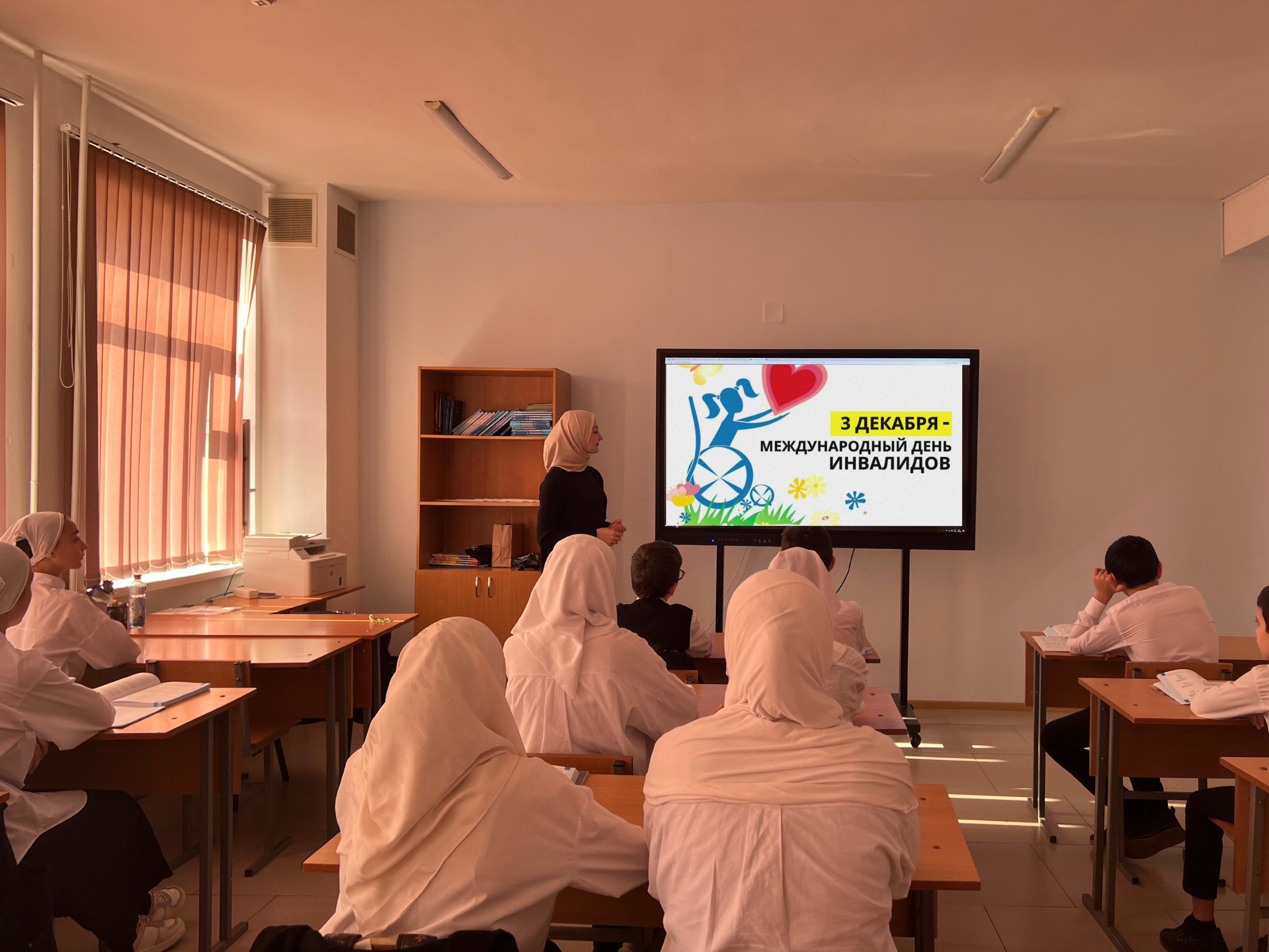 06.12.20243 декабря в МБОУ «СОШ № 53» г. Грозного, в рамках Единого дня профилактики, приуроченного к Международному дню инвалидов, с целью воспитания гуманного отношение к людям с ограниченными возможностями; чувства сопереживания милосердия, толерантности к инвалидам социальный педагог Бачаева Марха Сайдхусейновна провела классный час по теме «Дарите людям доброту».