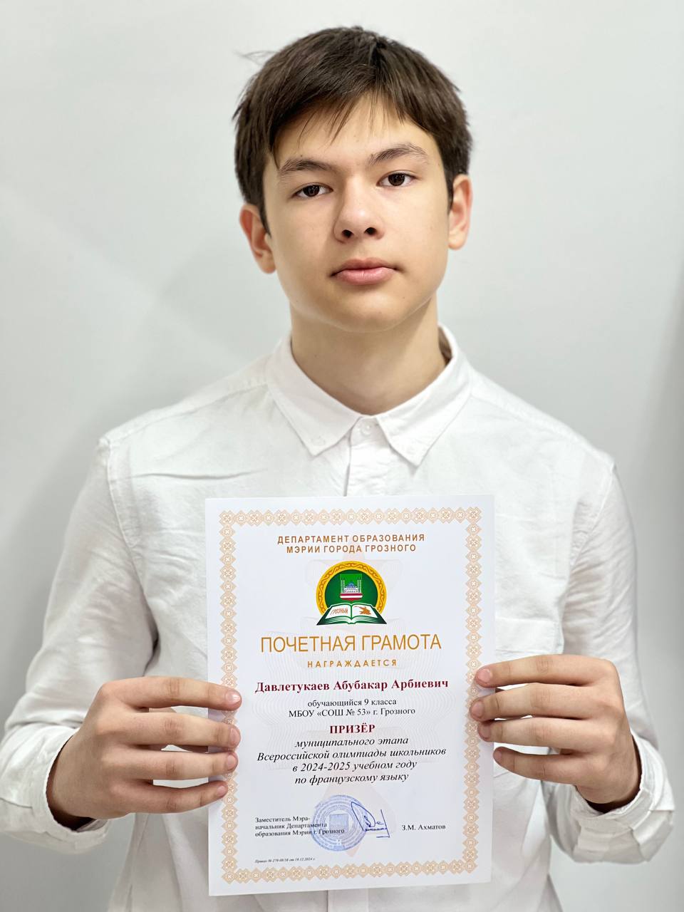 21.04.2025Довлетукаев Абубакар Арбиевич , ученик 9 класса МБОУ «СОШ №53» г. Грозного, стал призером муниципального этапа ВСОШ 2024-2025 учебного года по французскому языку!