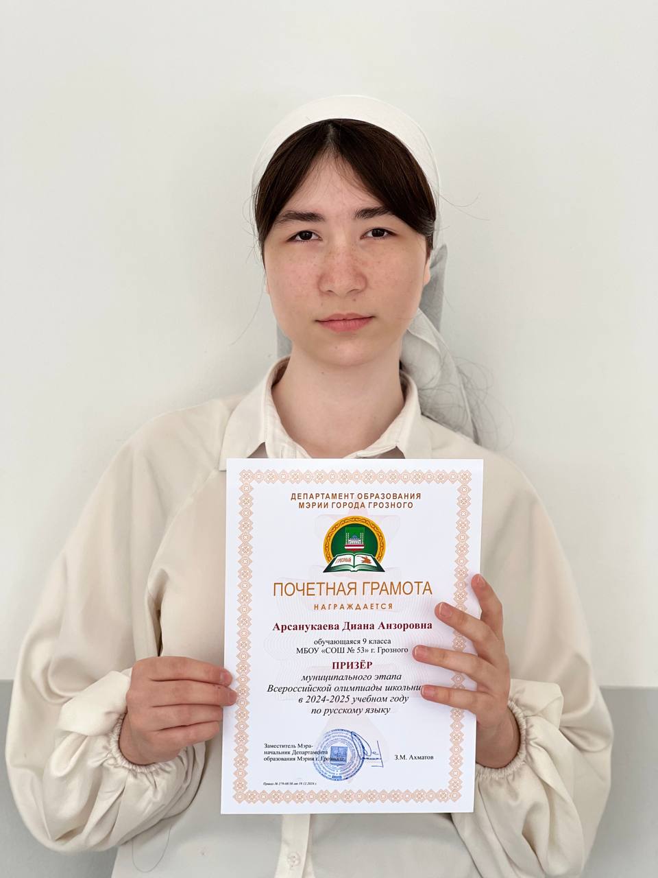 Арсанукаева Диана Амировна, ученица 9 класса МБОУ «СОШ №53» г. Грозного, стала призером муниципального этапа ВСОШ 2024-2025 учебного года по русскому языку!